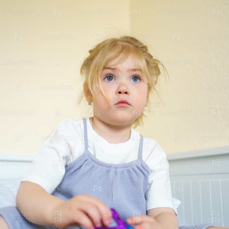 Малыш играет с магнитной строительной игрушкой, сидя на кровати