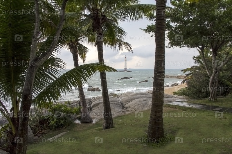 Сохранить Скачать Предварительный просмотр Вид на маяк в парке Дунтянь, Санья, Хайнань, Китай и пальмы