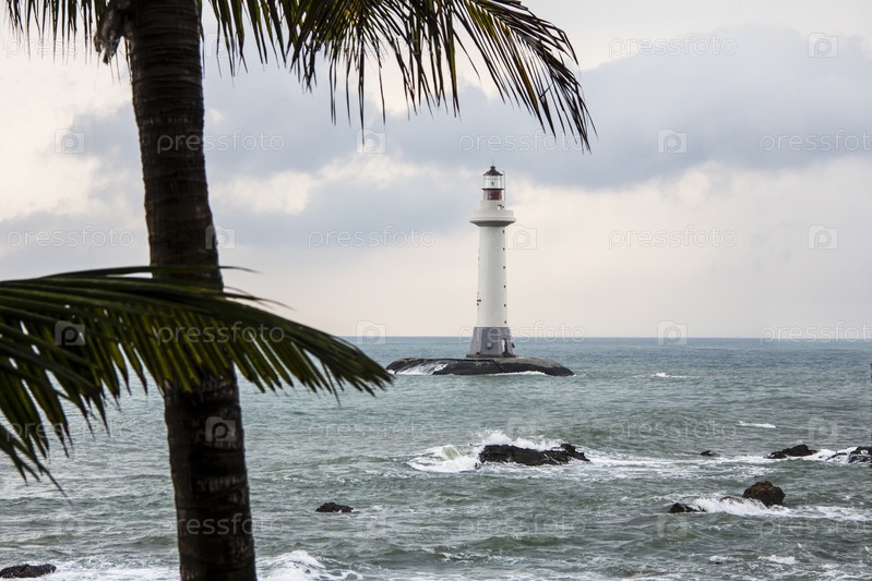 Сохранить Скачать Предварительный просмотр Вид на маяк в парке Дунтянь, Санья, Хайнань, Китай и пальмы