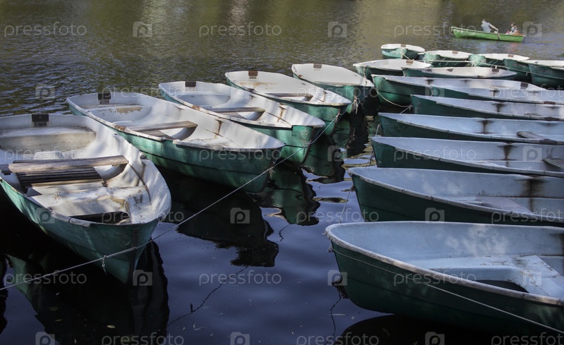 Зеленые лодки в парке, привязанные к пирсу у причалов