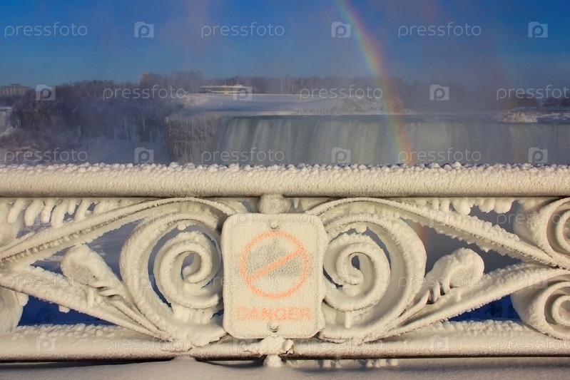 Декоративный железный забор, покрытый толстым слоем замерзшего тумана. Ниагарский водопад на заднем плане