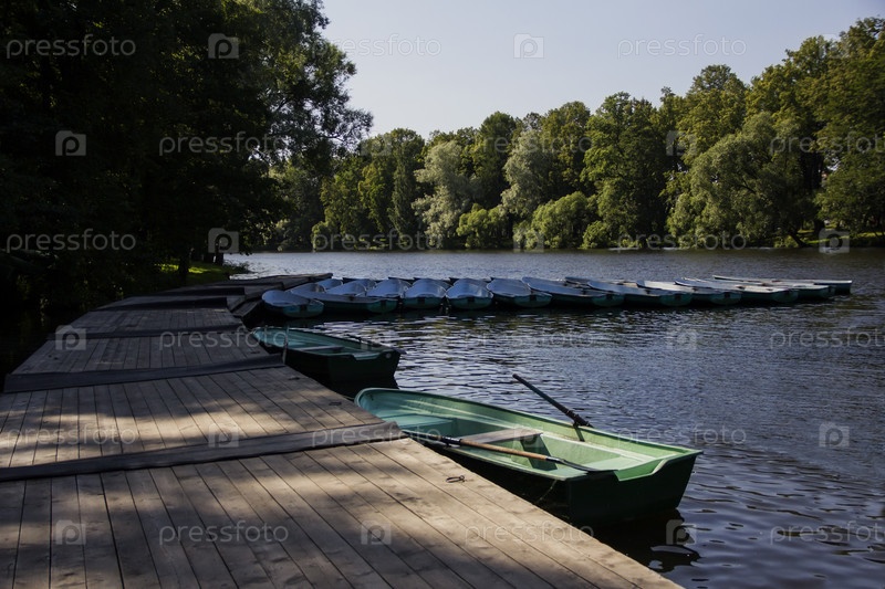 Зеленые лодки в парке, привязанные к пирсу у причалов