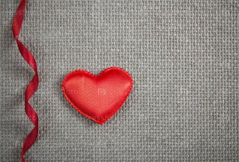 Красное текстильное сердце и красная лента на сером плетеном фоне. Открытка на День Святого Валентина