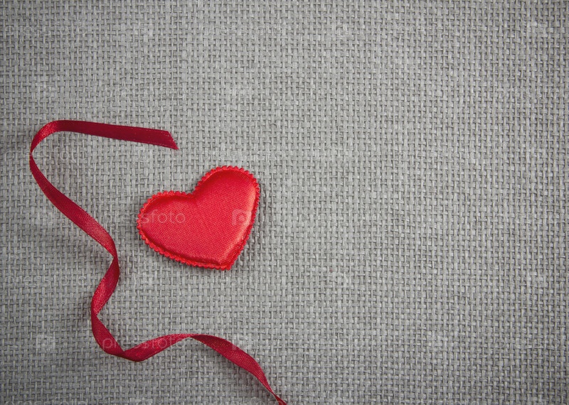 Красное текстильное сердце и красная лента на сером плетеном фоне. Открытка на День Святого Валентина