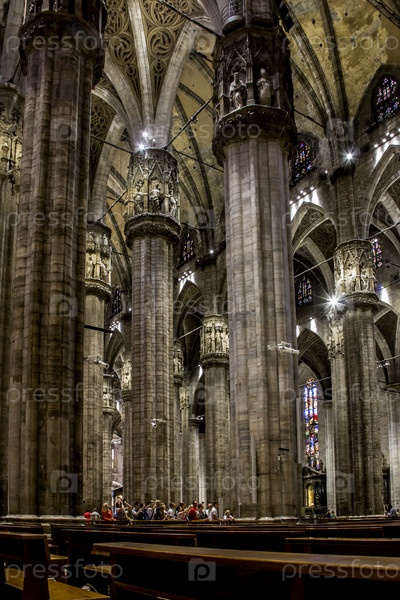 Милан, Италия - 18 августа 2015 г.: Внутри Миланского собора (Дуомо ди Милано). На строительство этого готического собора ушло почти шесть столетий. Является самой большой церковью в Италии и пятой по величине в мире