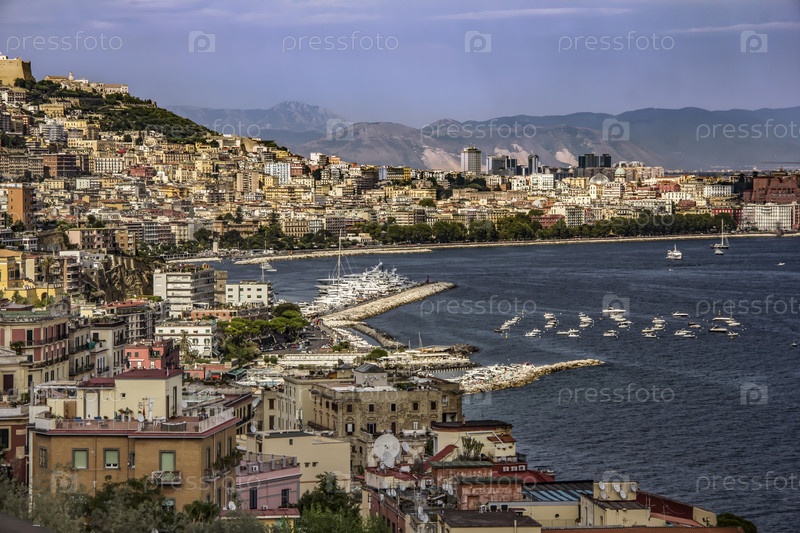 Панорамный вид на город Неаполь (Неаполь) с островом Капри, Кампания, южная Италия