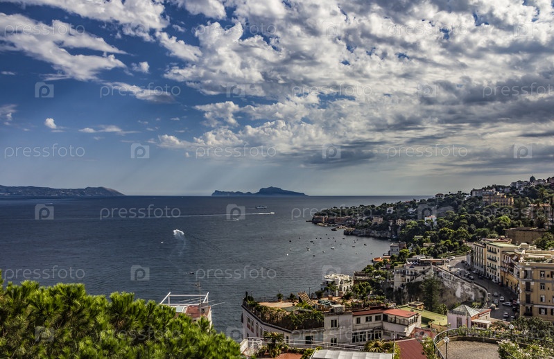 Панорамный вид на город Неаполь (Неаполь) с островом Капри, Кампания, южная Италия