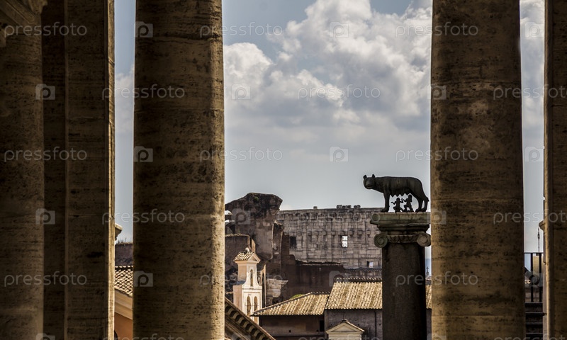 Скульптура волчицы, кормящей близнецов Рема и Ромула, основателей Рима, расположена между колоннами, Италия