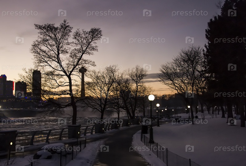 Смотровая дорога и парк у Ниагарского водопада на границе реки Онтарио между США и Канадой Онтарио в зимнее время ночью