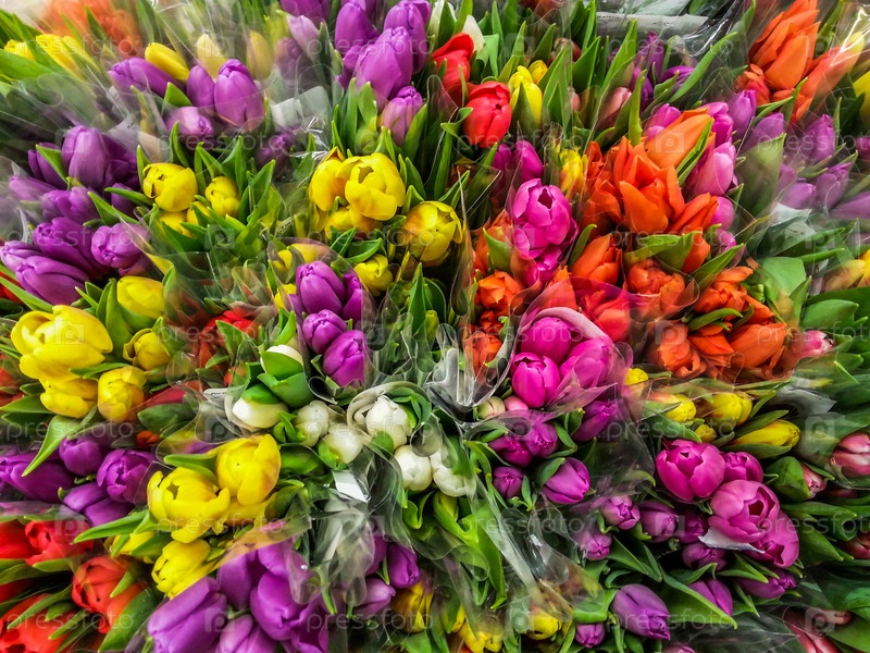 Свежие букеты цветов красочных тюльпанов на рынке перед праздником