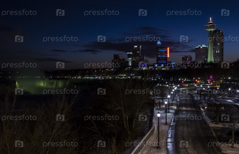 Смотровая дорога и парк у Ниагарского водопада на границе реки Онтарио между США и Канадой Онтарио в зимнее время ночью
