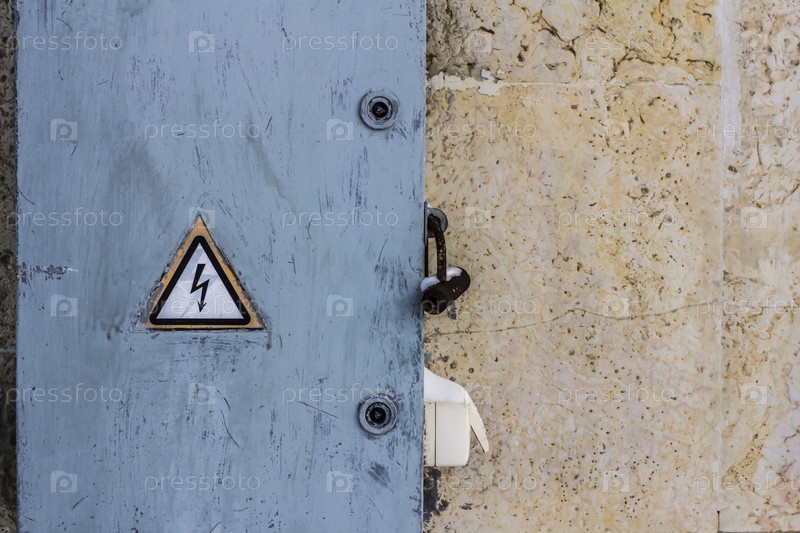 Знак опасности поражения электрическим током на запертой приборной панели с электричеством на поцарапанной окрашенной стене
