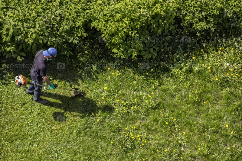 Мужчина-рабочий с электроинструментом, газонокосилкой, косилкой, косит траву, вид сверху
