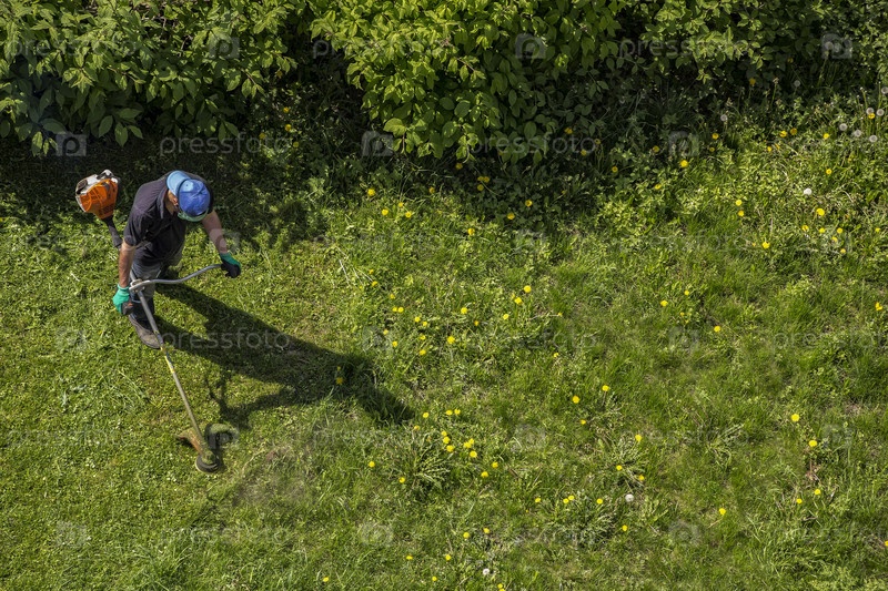 Мужчина-рабочий с электроинструментом, газонокосилкой, косилкой, косит траву, вид сверху