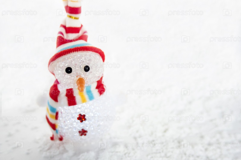 Снеговик в полосатой красочной кепке и шарфе на фоне снега. рождественские украшения