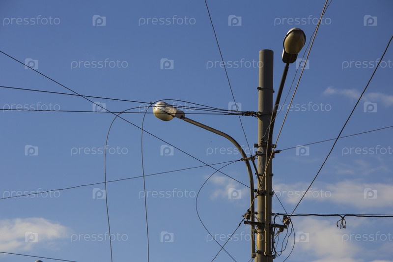 Фонарный столб с множеством кабелей, которые идут в разных направлениях. Электрический провод на столбе. хаотическая проволока с гнездом на шесте и фоне голубого неба