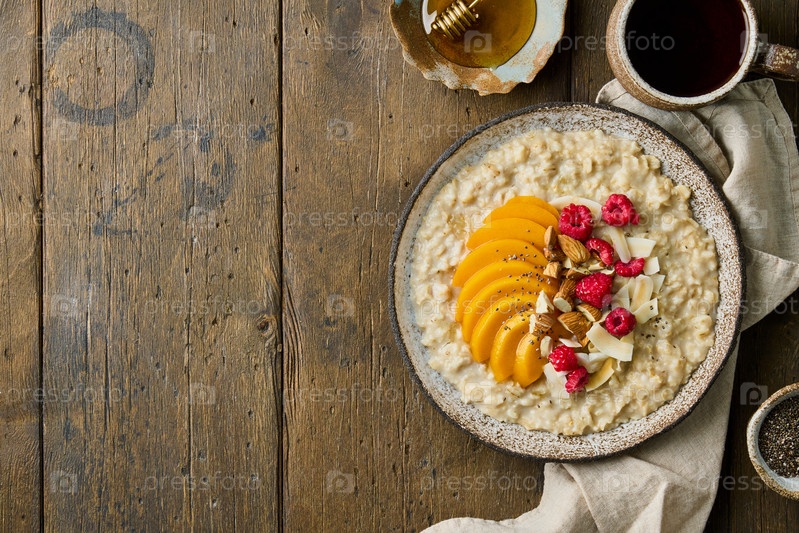 Овсяная каша с манго, малиной, миндальными орехами, кокосовой стружкой, семенами чиа, медом и чаем