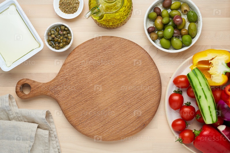Овощи, разделочная доска. Греческий салат хориатики. Вид сверху, пространство для копирования. Меню, рецепт, макет