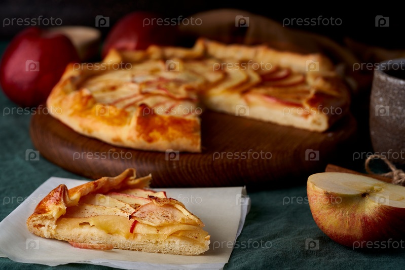 Яблочный пирог с кусочком галеты с фруктами, нарезанная сладкая выпечка на темно-зеленой скатерти