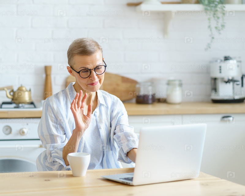 Современная счастливая пожилая женщина в очках машет веб-камерой на ноутбуке во время учебы онлайн