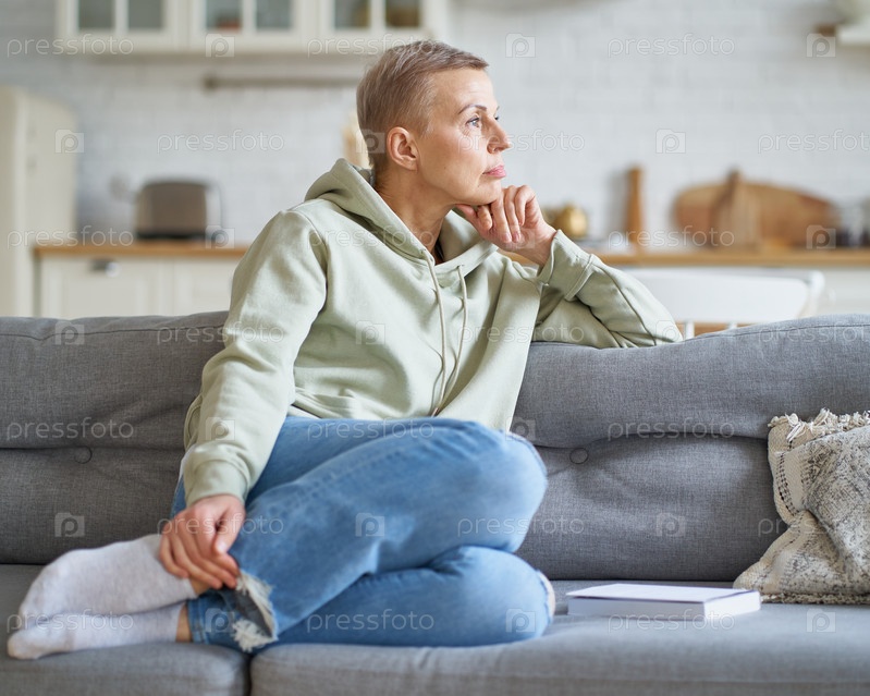 Красивая зрелая женщина в повседневной одежде мечтает о чем-то, отдыхая дома на диване