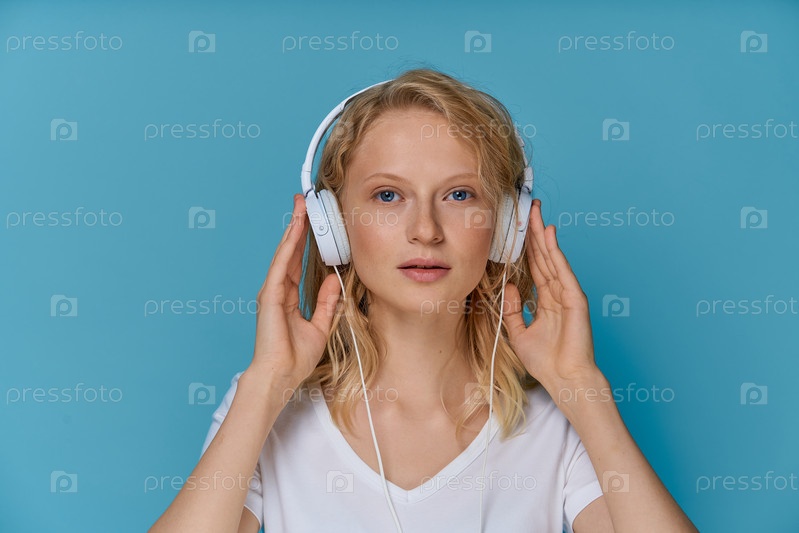 Портрет крупным планом молодой женщины, слушающей музыку через наушники на цветной ярко-синей стене тона