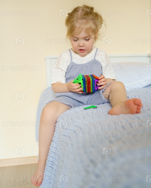 Малыш играет с магнитной строительной игрушкой, сидя на кровати