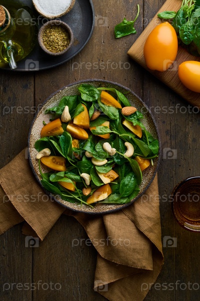 Очень вкусный салат с оранжевыми томатами, шпинатом, кешью, оливковым маслом и приправой