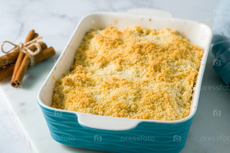 Яблочная и грушевая крошка, пирог со штрейзелем. Сладкий десерт с компотом. Вид сбоку, крупным планом