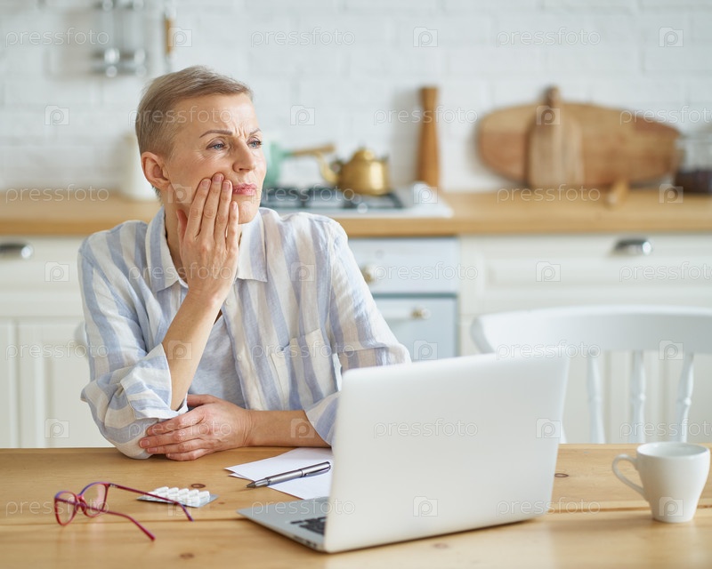 Разочарованная зрелая женщина, страдающая от зубной боли во время работы в Интернете из дома