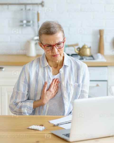 Женщина средних лет объясняет симптомы врачу онлайн, сидя дома на кухне