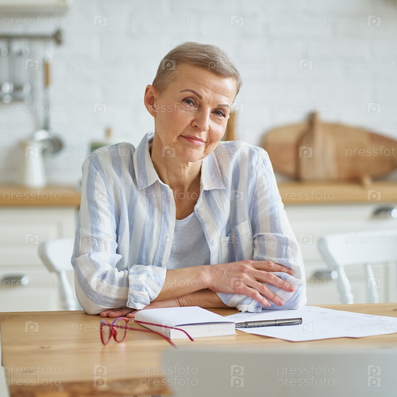 Позитивная зрелая женщина сидит за деревянным столом на кухне и улыбается в камеру, работая дома