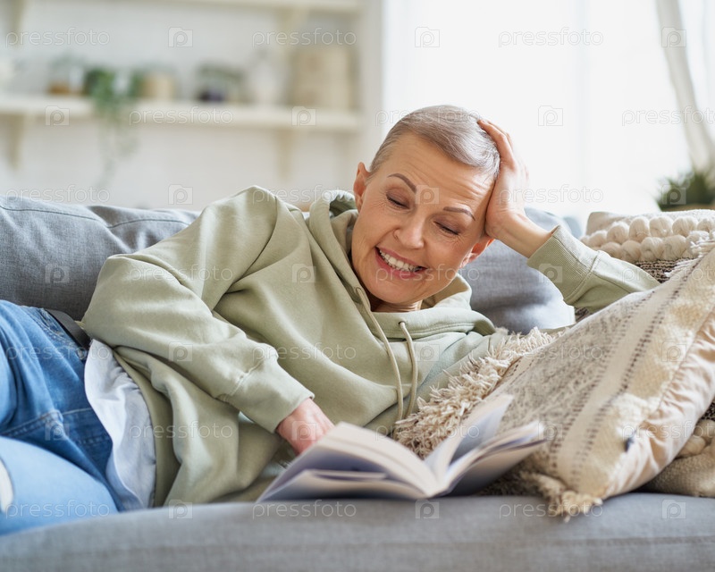 Веселая счастливая женщина читает книгу и улыбается, отдыхая дома на диване