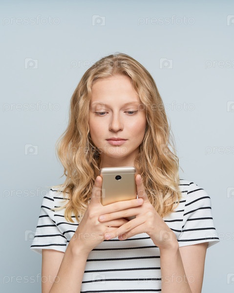 Симпатичная женщина выглядит в социальных сетях на мобильном телефоне, стоящем возле белой стены
