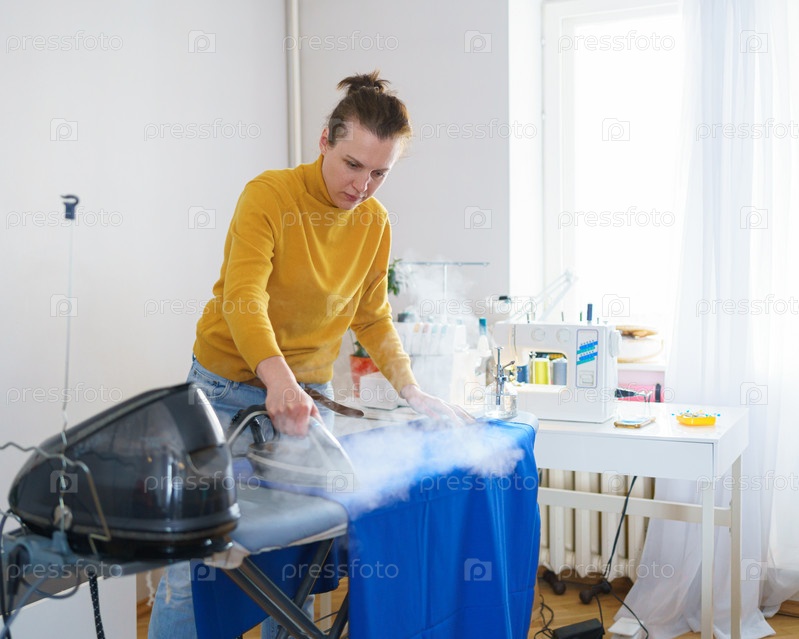 Женщина-швея или домохозяйка гладит ткань перед шитьем во время работы на своем рабочем месте
