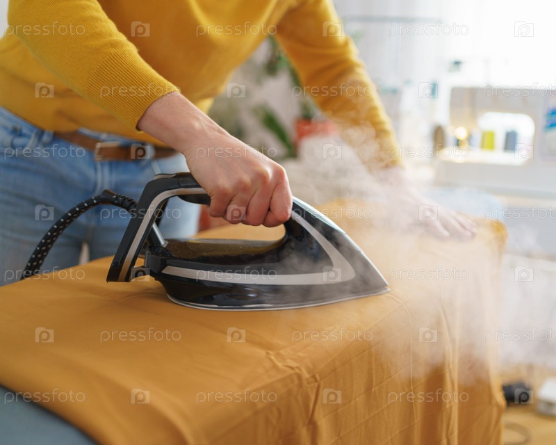 Женщина-швея гладит оранжевую ткань во время работы на своем рабочем месте