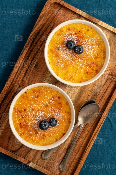 Испанская каталонская крема, богатая основа из заварного крема, покрытая слоем карамелизированного сахара. Вид сверху, вертикальный