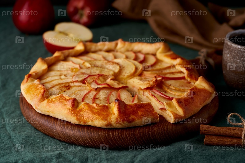 Яблочный пирог, галет с фруктами, сладкая выпечка на темно-зеленой скатерти, крупный план, вид сбоку