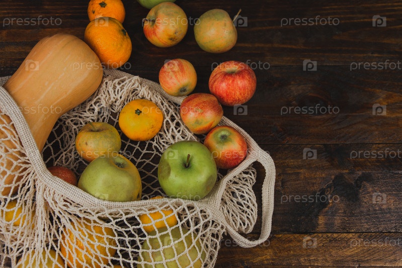 Плоская композиция с эко-сумкой для покупок. Яблоки, тыква в сетке. Экологичная, безотходная, без пластика, многоразовая концепция