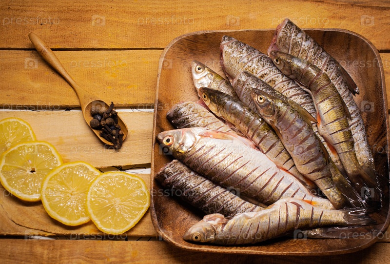 Маленькая свежая рыба на деревянной тарелке на деревянной коробке, украшенная ломтиками лимона и ложкой со специями. Вид сверху