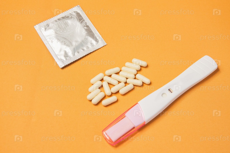 Противозачаточные таблетки, презерватив и отрицательный тест на беременность на желтом фоне