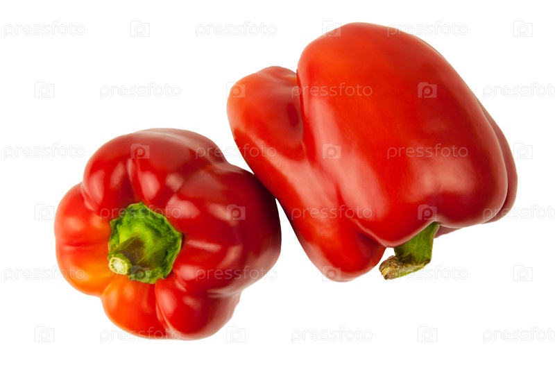 Два кусочка сырого свежего красного сладкого перца на белом фоне