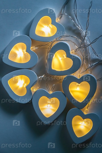 Гирлянда в виде сердечек светится желтым цветом. Вертикальная ориентация