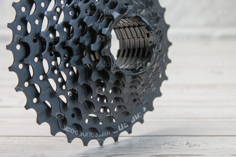 Новая черная велосипедная кассета Shimano стоит зубами на досках