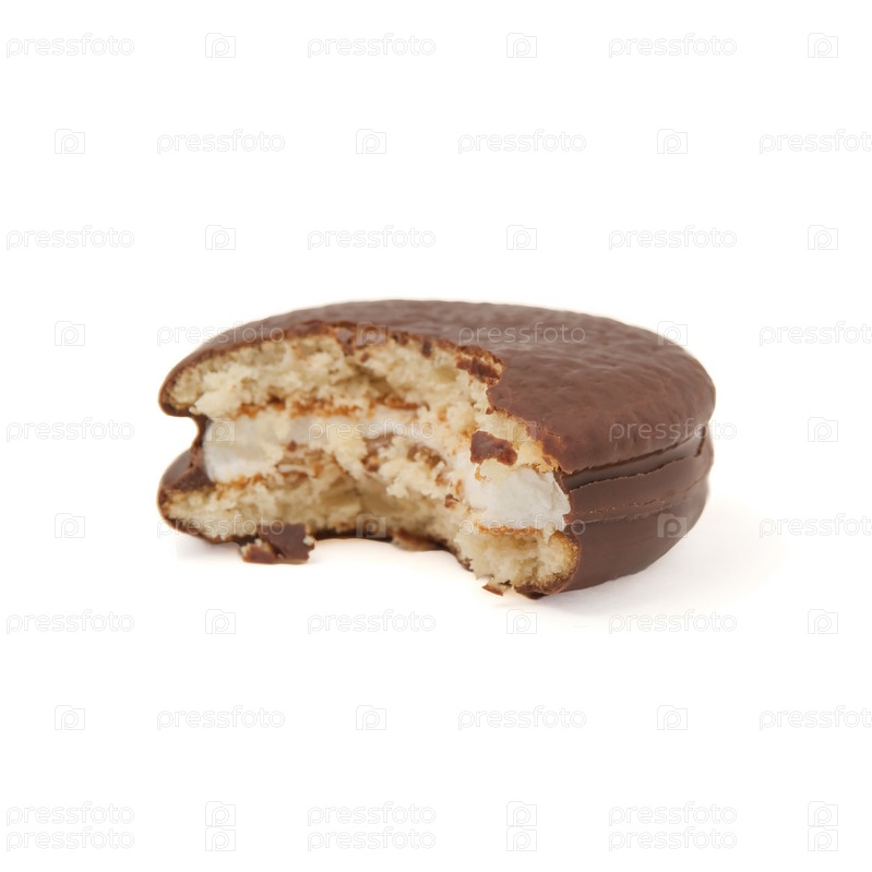 Кусок шоколадного торта chokopie съеденный, изолирован на белом фоне, вид со стороны