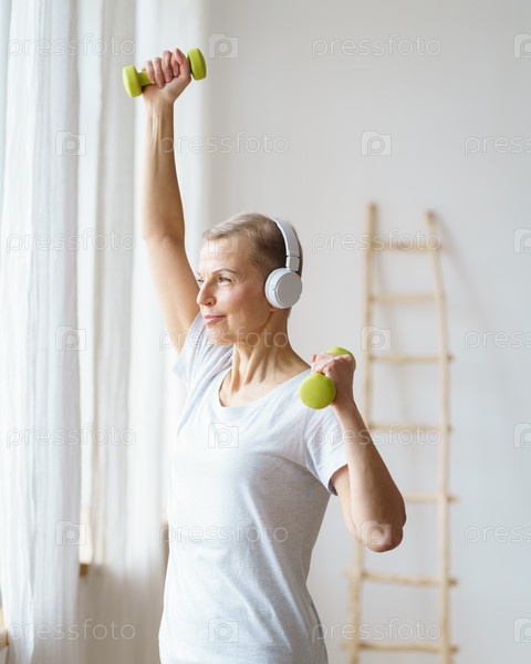 Портрет счастливой пожилой женщины, занимающейся фитнесом с гантелями дома. Зрелая женщина, вертикальная