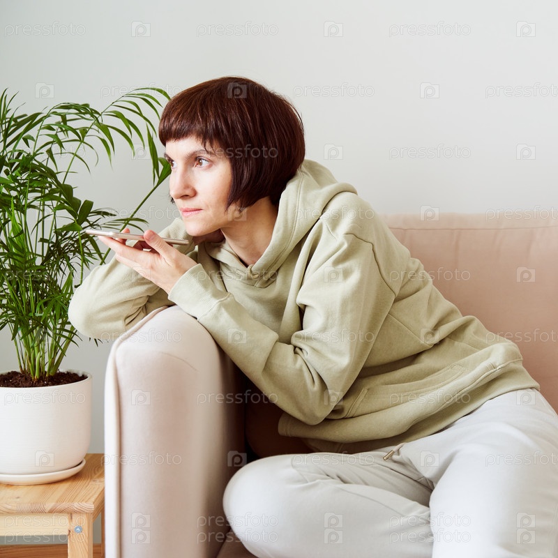 Портрет зрелой женщины, записывающей аудиосообщение, говорящей в микрофон мобильного телефона. Женщина средних лет в домашней спортивной одежде пастельных тонов сидит на диване и разговаривает в аудиочате