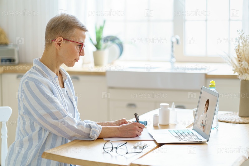 Пожилая женщина разговаривает онлайн с врачом во время covid 19, сидя дома на кухне