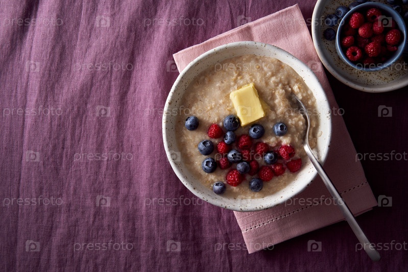 Овсяная каша с черникой, черникой. Завтрак в белой миске и ложке со свежими ягодами