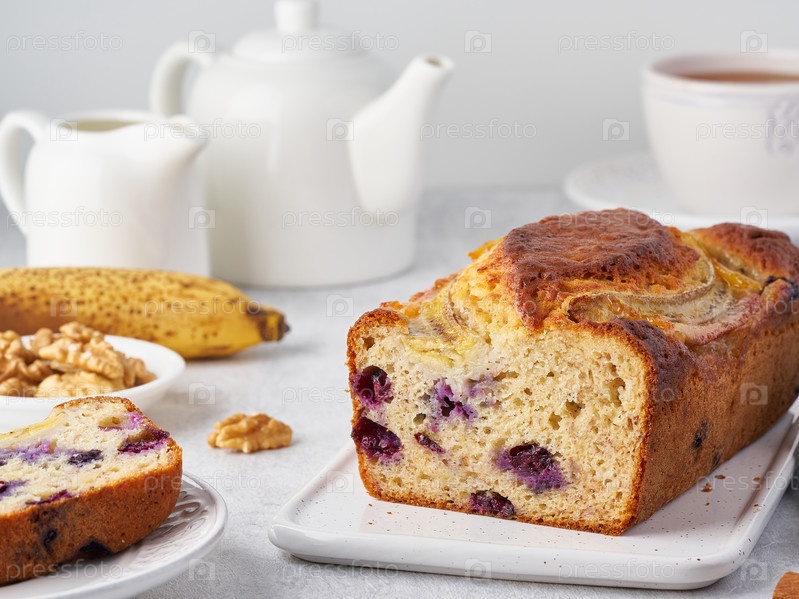 Банановый хлеб, нарезанный торт с бананом и черникой. Утренний завтрак с чаем